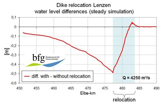The highest effect of the measure can be stated next to the first opening of the dyke (on the "evil place") and it decreases towards the downstream part of the dyke relocation. Further downstream from the dyke relocation, the measure does not have any effect anymore on the water level. Upstream, the positive effect diminishes with an increasing distance. This shows that the measure has a very clear, but mainly regionally working impact. In order to solve the important flood problems of the Elbe river, it is indispensible to carry out other dyke relocation measures.