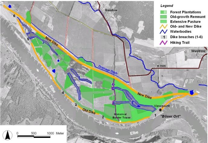 Alluvial forests have been initiated by planting respective tree species. Furthermore, an half-open pasture landscape is maintained. An impact has been stated amongst others with regards to the development of a diverse avifauna.
