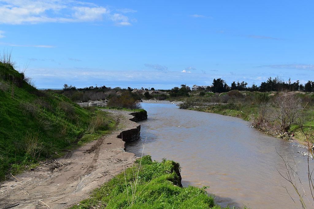 Along the Ezousa River alluvial channel east of Paphos, from the coast inland to ~8 km upstream. Infiltration pond groups lie between Acheleia (near the Paphos WWTP and airport) and the Agia Varvara area