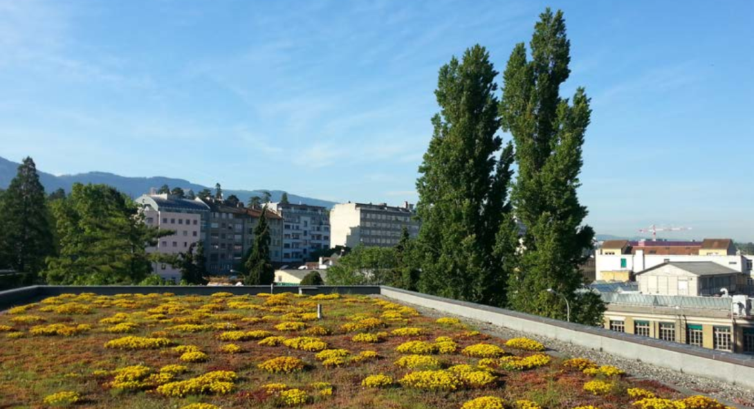 Local monitoring in Geneva (TVEG/HEPIA) confirms hydrologic benefits beyond the original design assumptions: storm peaks are delayed and attenuated, with up to ~75% reduction for a summer event (and ~48% in winter), and a larger share of water returned by evapotranspiration (~61%) relative to a reference roof. The Canton’s “Nature en ville” programme documents biodiversity outcomes and provides up-to-date technical guidance; at cantonal level, compliant green roofs can lower stormwater fees.