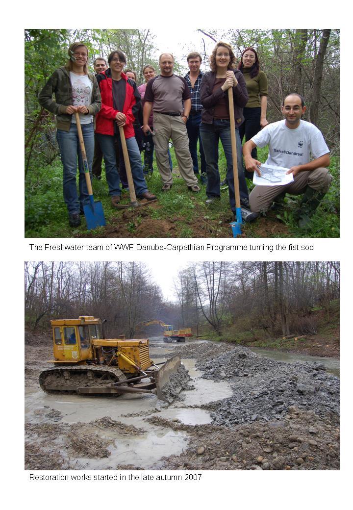 WWF’s Danube-Carpathian Programme, together with residents of Mindya (Veliko Tarnovo), reconnected the Veselina River to a former meander near the village. When the bend was cut off in the past the channel incised by ~150 cm, so a low sill was built (works 2007–2008) to raise water levels and route flow back into the old course.