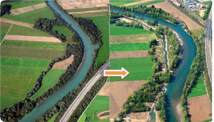 By adapting open check dams the bed load balance of a river can be improved. The reconnections of side arms, the creation of riparian forests and meadows support a greater biodiversity.