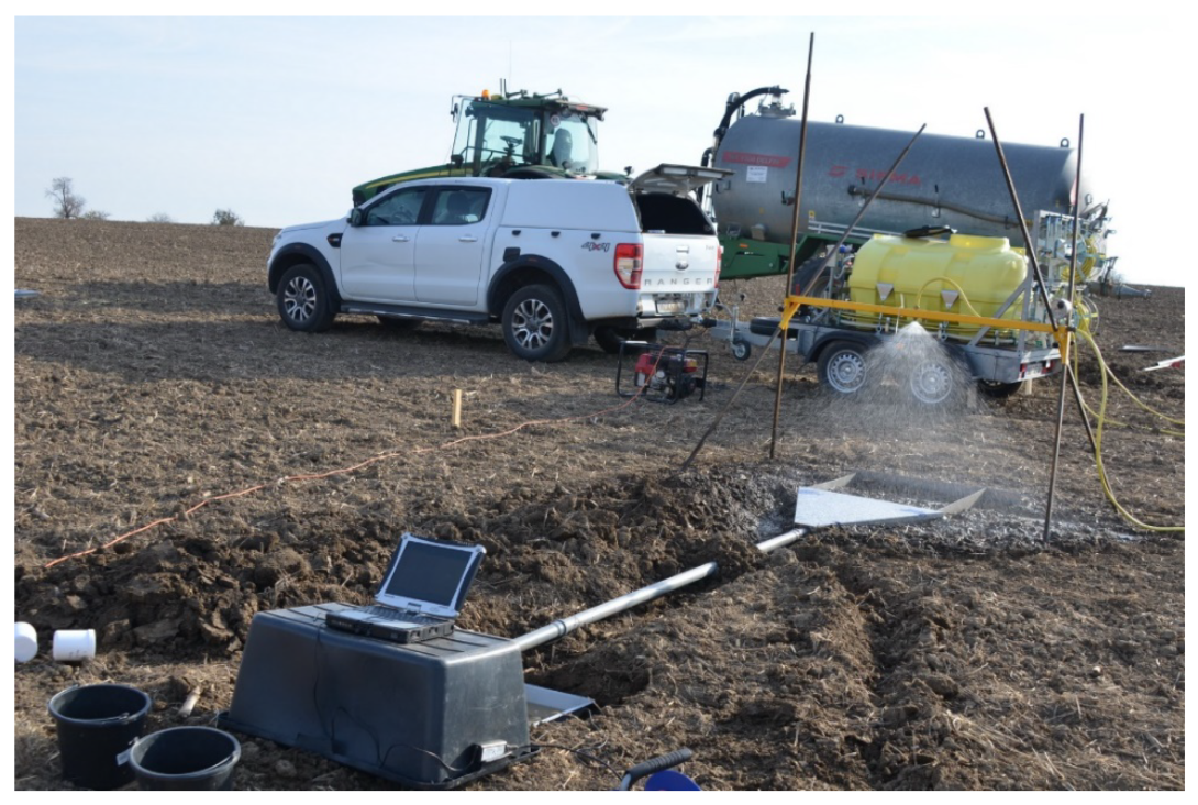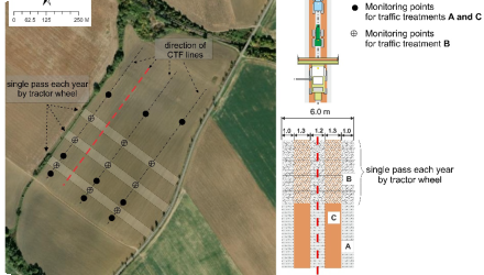 The objective was to test whether confining traffic reduces rainfall-induced runoff and soil loss under Central European conditions. The team combined erosion risk mapping using USLE and RUSLE with targeted field measurements. In 2021 they used a rainfall simulator on three locations representing different traffic intensities. They also assessed soil physical condition using a cone penetrometer.