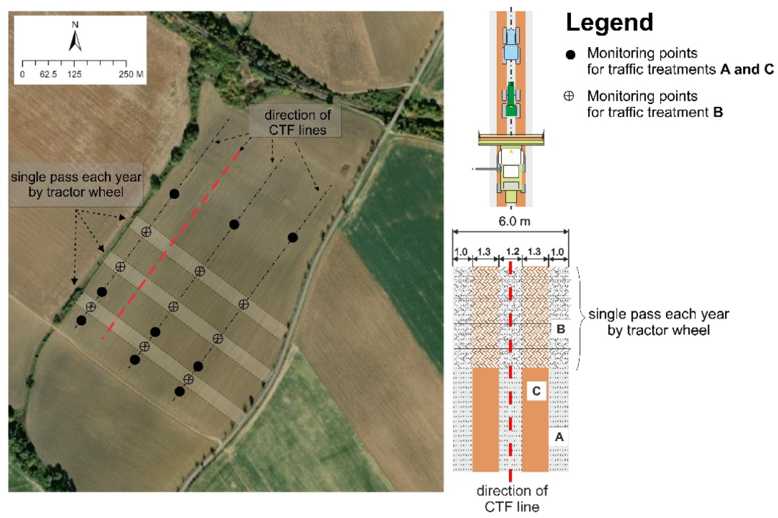 This case study documents a long-term Controlled Traffic Farming (CTF) experiment on a 16 ha steep arable field operated by the Slovak University of Agriculture near Kolíňany, Nitra Region, Western Slovakia. CTF was introduced in 2009 and the field-scale layout was established in 2010 using a 6 m machinery module with permanent tramlines. The design confines wheel traffic to fixed lanes so that about half the field remains traffic-free. Slopes are mostly 3 to 7 % on silt-loam soils in a continental climate.